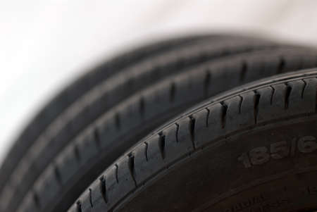 Close-up of the tread of a spare tire of a car on a white background in a photo studio with summer tires. Spare tire for replacement during seasonal car repair in a workshop or garage.