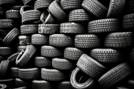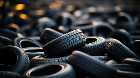 A visually striking image of used tires covered in black tar, highlighting the environmental challenges of waste management and pollution.