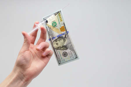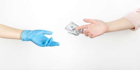 Male hand gives dollars to the doctor. Bribe to the doctor, purchase of a remedy against coronavirus.