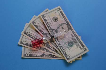 Medical syringe vial with vaccine and american dollars on blue background