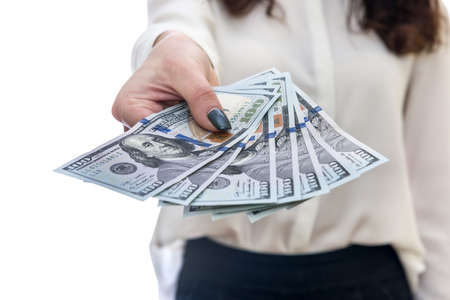 Hand giving dollar money, close-up. Hands holding a dollar bills on white background with copy space. Salary, earning and savings concept
