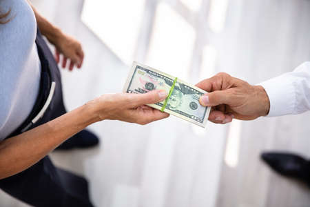 Close-up Of A Person Giving Bribe To Businessperson At Workplace