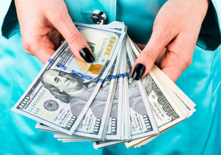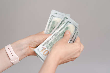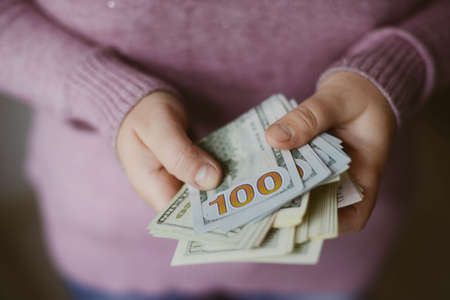 Woman counting money, counting dollars close up