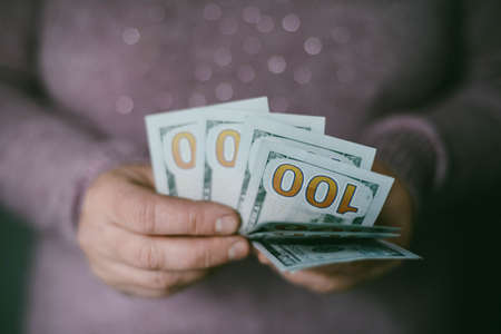 Close-up of an elderly woman's hands holding money in 100 dollar bills, compensation.