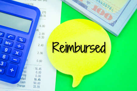 calculators, banknotes, receipts and conversation boxes with the word reimbursed