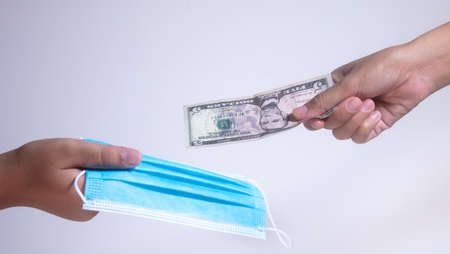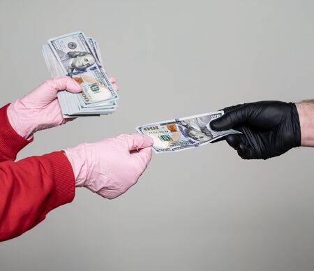 Two hands holding or gives US dollar in medical gloves for protect, quarantine period covid19