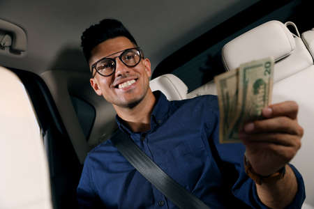 man holding dollar bills on background of car with open gas tank, close-up of hands
