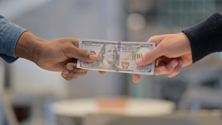 Close up of male African American waiter receiving tip from generous hotel guest. Tourist giving money cash to restaurant worker, making order, paying bill. Tipping in hospitality industry