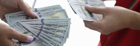 Two people are handing each other dollar bills, they are mutually beneficial business partners, they commit bribery fraud for business interests. The concept of corruption and bribery.