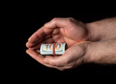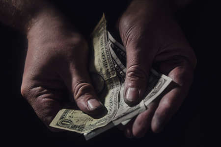 Man hands hold torn money US dollars on a black background, close-up. USA cash in the dirty hands of an american poor man on a dark background