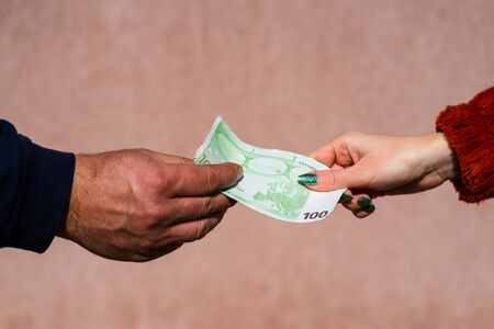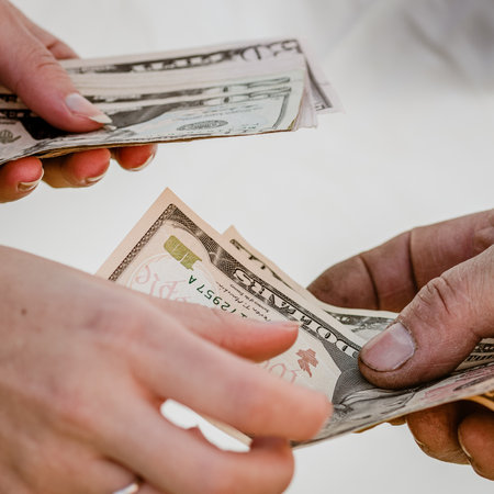 Closeup of woman passing money to man