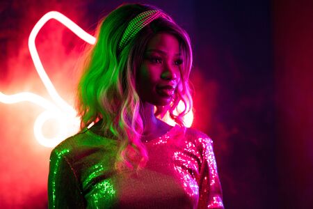 Stylish sexy woman in neon lights. Young african american woman in shiny blouses standing like Queen of night on abstract blurred background with bright ultraviolet glow. Fashion concept.