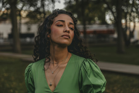 Curly-haired woman stands peacefully under soft lighting, exuding calmness in a green dress surrounded by trees and buildings.