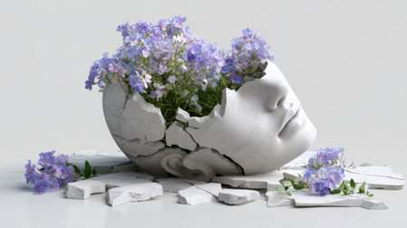 A stunning artistic representation of a cracked marble head filled with blooming flowers, symbolizing growth and transformation. Ideal for modern art and nature themes.