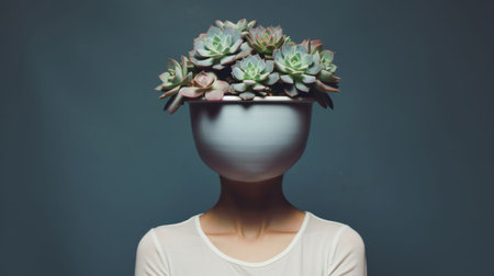 Contemporary, art and head of woman with plant for mental health, depression and floral abstract
