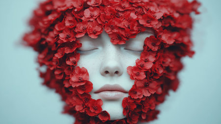 Close up of a serene female face adorned with vibrant red flowers, symbolizing beauty, nature, and tranquility, perfect for wellness and nature themed projects
