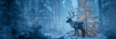 Reindeer standing in deep snow, illuminated by magical Christmas lights in a winter forest. Reindeer standing in snowy forest with magical Christmas lights