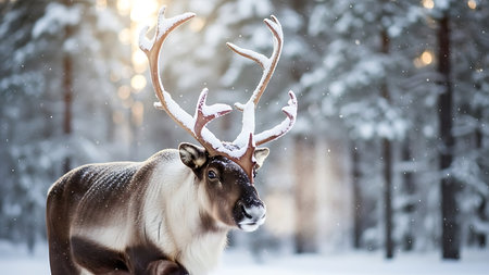 A majestic reindeer with antlers standing in snowy landscape