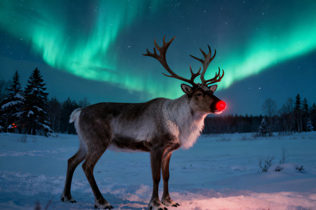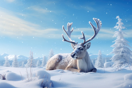Santa's faithful reindeer take a break in a peaceful snowy meadow; ready to soar through the night on Christmas Eve.