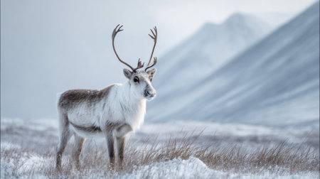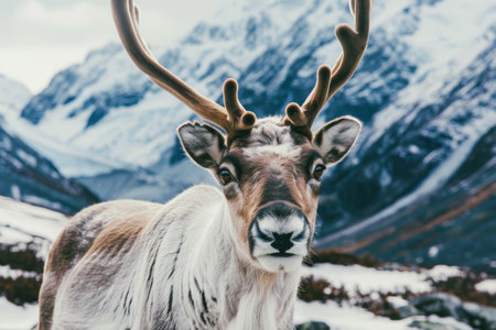 A reindeer stands gracefully in a snowy field, showcasing its impressive antlers against a backdrop of icy mountains. The winter scene evokes tranquility and beauty.