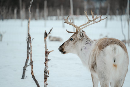 A reindeer walking through a snowy forest with birch trees. Tromso, Norway