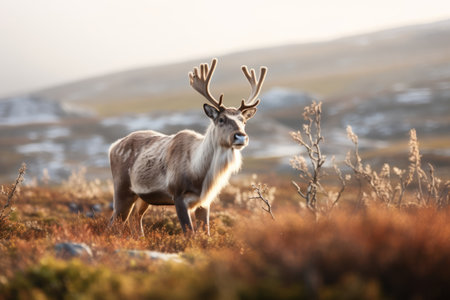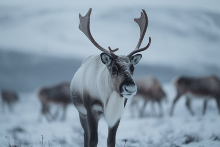 canadian caribou penguin photo with bokeh-filled background. overcast weather enhances lighting. aim for high resolution (32k) to capture intricate details of majestic creatures. ai generated
