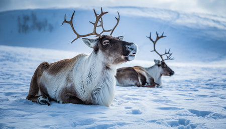 Two reindeer are resting in the snow. The reindeer in the foreground is looking to the side with its mouth open. The background is a snowy, hilly landscape.
