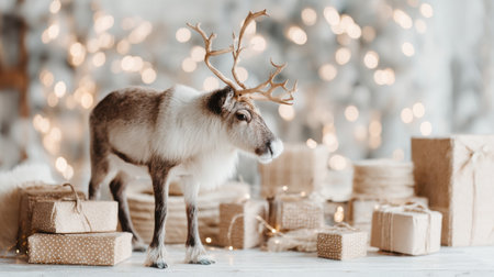 A charming reindeer stands near beautifully wrapped gifts and a delicate tree, creating a serene and festive atmosphere perfect for holiday themes.