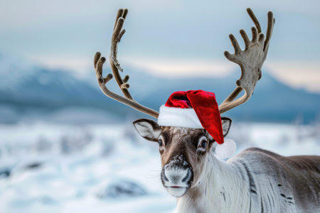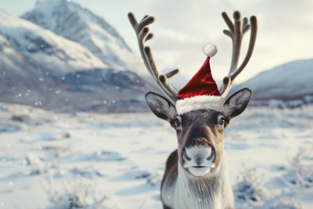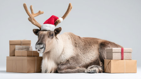 This charming image features a reindeer wearing a festive Santa hat surrounded by neatly wrapped Christmas gifts, evoking the joy and warmth of the holiday season.
