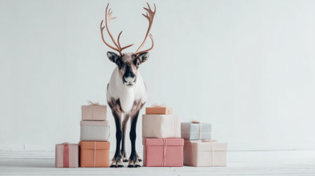 A charming reindeer stands proudly among beautifully wrapped gift boxes, creating a whimsical holiday scene perfect for seasonal decorations and festive celebrations.