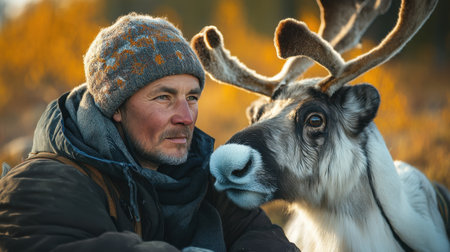 A man sits calmly beside a reindeer, both captured in a tranquil outdoor setting filled with warm autumn colors. The man gazes thoughtfully while the reindeer shows gentle curiosity, creating a bond amid nature's beauty.