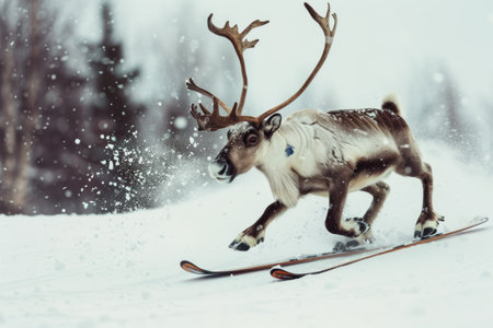 Reindeer at snow forrest abstract background. Animal and nature concept. Generative ai.