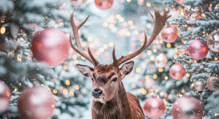 Majestic deer with antlers in a magical winter forest with snow-covered Christmas trees and sparkling pink ornaments.