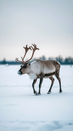 A stunning reindeer strides gracefully across a snow covered expanse showcasing its impressive antlers The serene winter setting highlights the beauty of this iconic Arctic animal