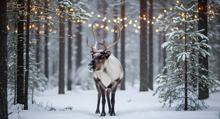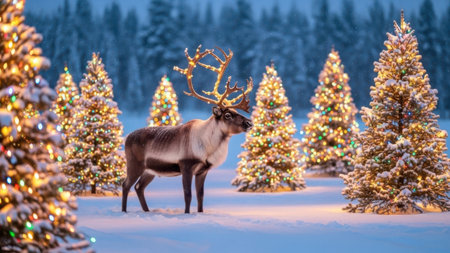 A majestic reindeer with large antlers stands in a snowy clearing surrounded by Christmas trees adorned with colorful lights, evoking a festive holiday atmosphere.