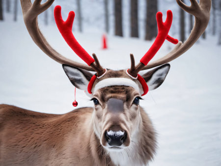 Reindeer with a red Christmas hat on his head in winter forest