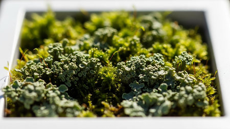 Detailed macro view of vibrant green moss and lichen growing in a white planter box.