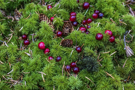 Cranberries and pine cones on the green moss in the forest