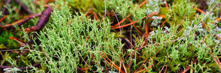 Forest floor of lichen, close-up. Northern evergreen forest, swamp. Lapland, Finland. Ecology, ecosystem, environmental conservation, pure nature. Science, education concepts