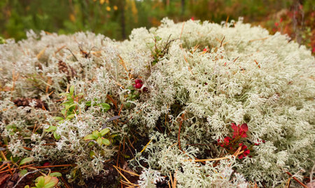 Yagel, a beautiful deer moss, grows in the forest, scandinavian nature. Forest background. High quality photo