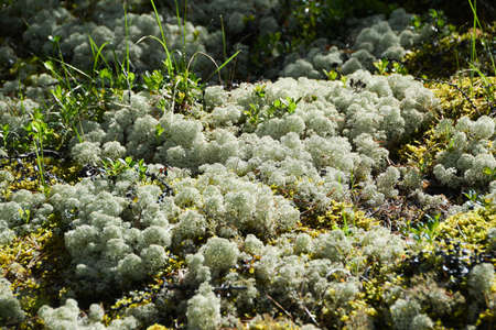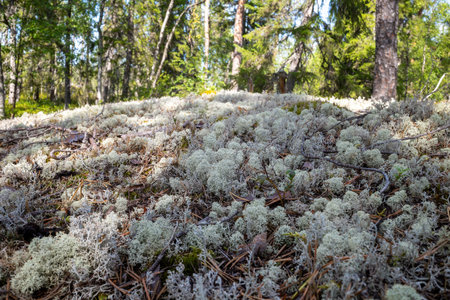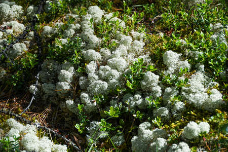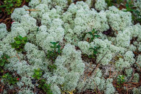 Deer lichen Cladonia rangiferina in the forests of the Kola Peninsula in Russia. Pine forest with reindeer lichen on the hill.