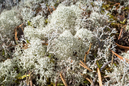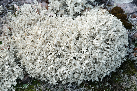 White fluffy Cladonia stellaris lichen on forest floor.
