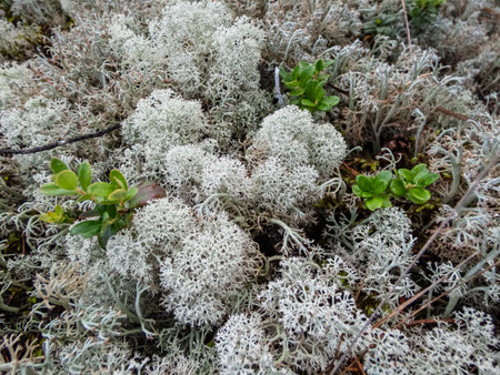 Northern Reindeer Lichen or Start Reindeer Lichen growing in thin soil over rocks, in open coniferous forests, often common in lichen woodlands. Cladonia stellaris