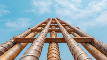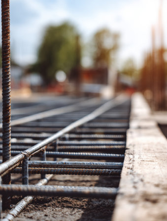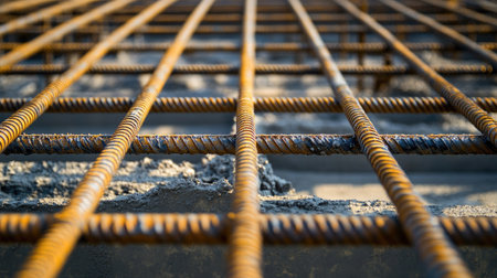 Close-up view of steel rebar framework on a construction site, showcasing its intricate texture and structure. The natural lighting highlights the industrial elements beautifully.