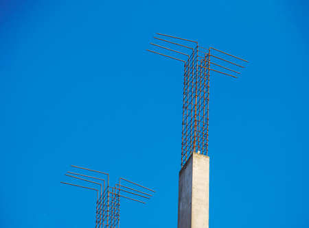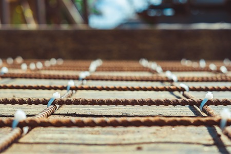 Close up view of reinforcement of concrete. Geometric alignment of Rebars on construction site. Reinforcements steel bars stack.