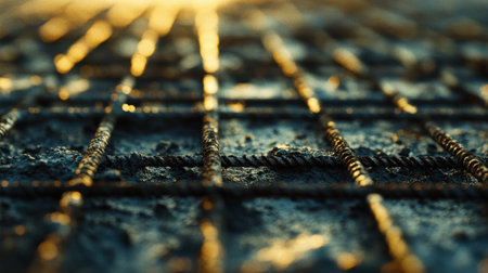 A captivating close-up of reinforcement mesh on a construction site ground at sunrise, showcasing intricate textures and patterns of industrial materials in an urban environment.