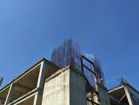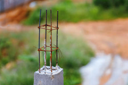 steel rebar for reinforcement concrete at construction site with house under construction background,Industrial background.Rusty rebar for concrete pouring.