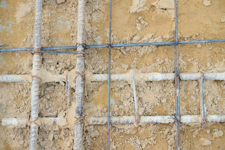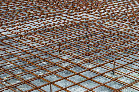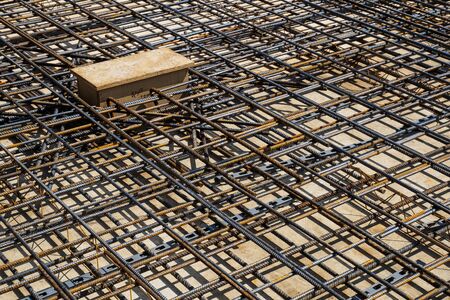 The steer wire mesh for concrete floor in construction site. Steel armature grids for pouring concrete in building foundation