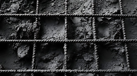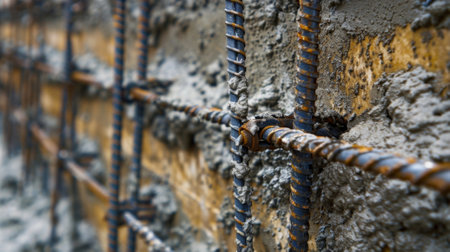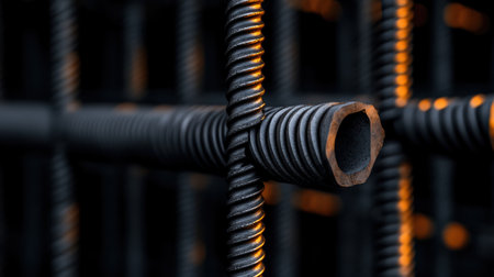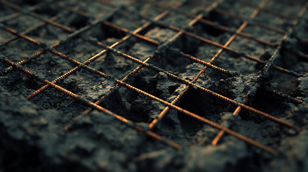 Intricate details of reinforced steel bars reflect the artistry of construction. The interplay of light and shadow emphasizes the strength and durability needed for structural integrity.