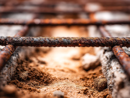A close-up image capturing the intricate details of rusty rebar embedded in concrete, with sunlight casting a warm glow, ideal for industrial themes.